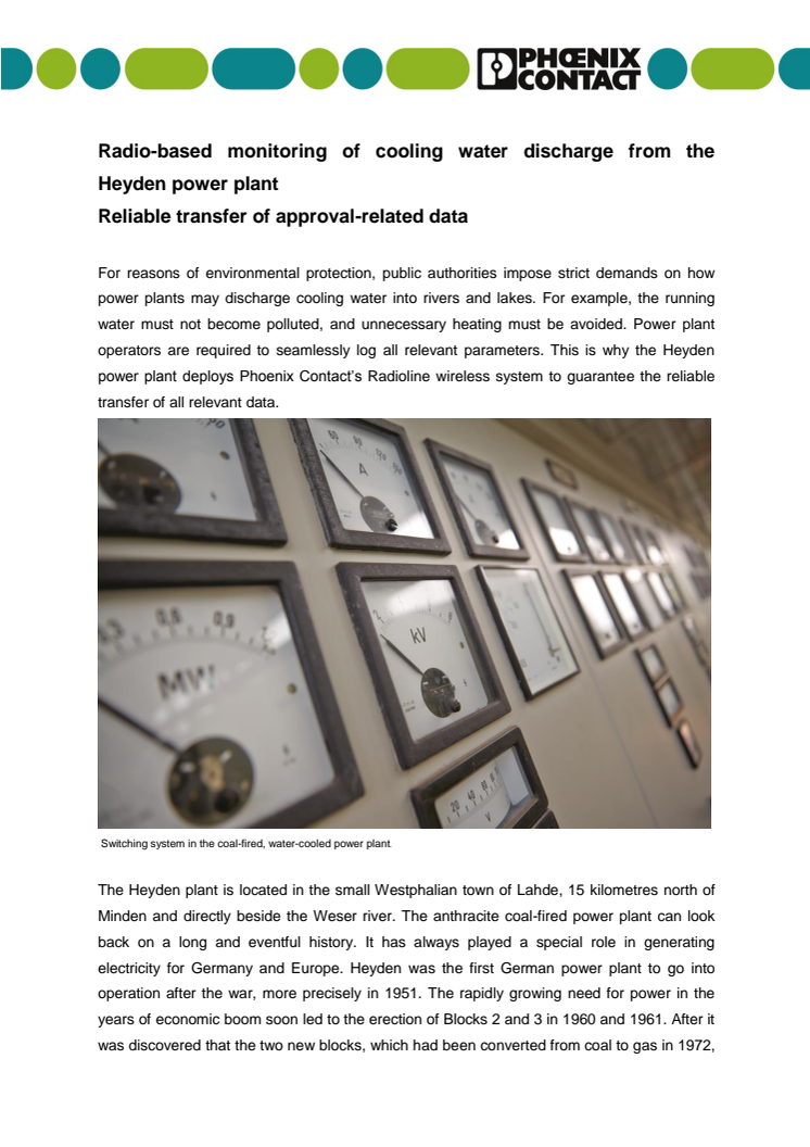 For reasons of environmental protection, public authorities impose strict demands on how power plants may discharge cooling water into rivers and lakes. Power plant operators are required to seamlessly log all relevant parameters. This is why the Heyden power plant deploys Phoenix Contact’s Radioline wireless system to guarantee the reliable transfer of all relevant data.