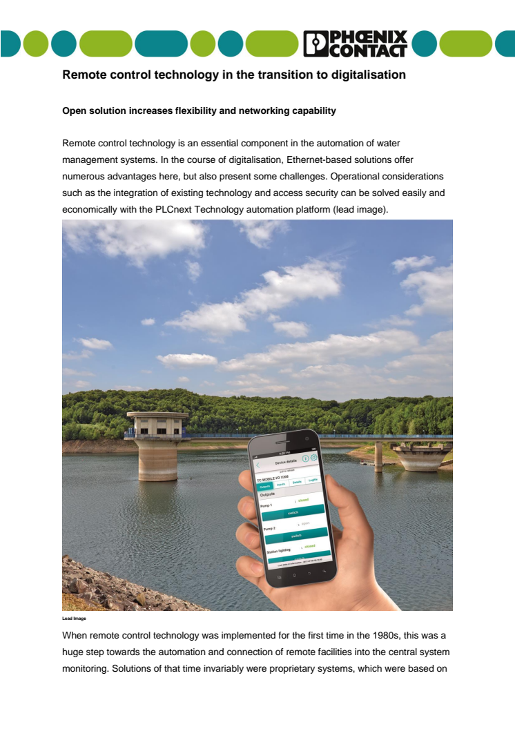 Remote control technology is an essential component in the automation of water management systems. In the course of digitalisation, Ethernet-based solutions offer numerous advantages, but also present some challenges. Operational considerations such as the integration of existing technology and access security can be solved easily and economically with the PLCnext Technology automation platform