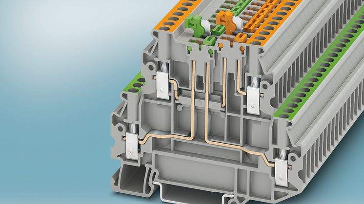 The compact UTT 2,5-2MT-P/P double-level knife disconnect terminal blocks from Phoenix Contact are available in various versions with one or two disconnect knives for conductors of up to 4 mm². The space-saving design with a 5.2 mm pitch allows for a high density in the controller wiring. Circuit identification is made easy through colour coded knife disconnect levers.
