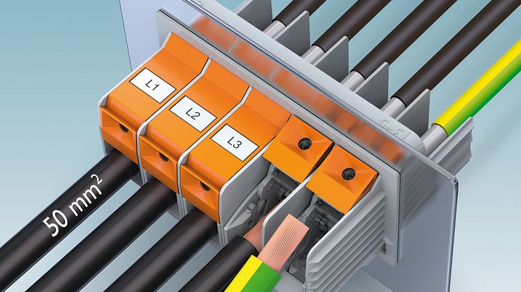 The new TW 50 high-current feed-through terminal block from Phoenix Contact with the new T-LOX connection technology, which operates according to the toggle lever principle, offers a reliable, convenient cable connection.