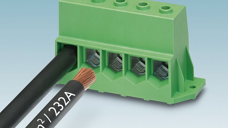 Phoenix Contact’s new MKDSP 95 PCB terminal can transfer currents of up to 232 A directly to the PCB. The terminal accepts conductors with a cross-section of up to 95 mm² at voltages up to 1,000 V.