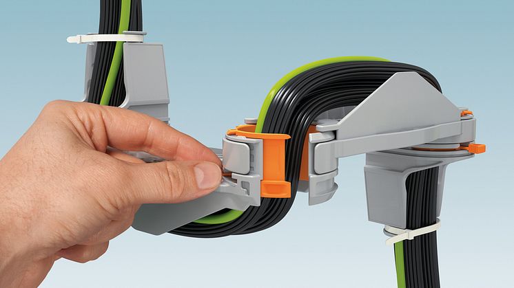 The CGS cable guiding system with the swivelling arm from Phoenix Contact facilitates the safe routing of conductors, cables, and cable harnesses to the control cabinet door or to the swivelling mounting frame. The swivel joints – pending patent approval – can be opened and closed without the need for tools so that the cables can be inserted through the joints along with the connectors and fed through. This is easier and saves time compared with installation using cable conduits.