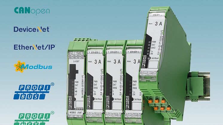 The new versions of the Contactron hybrid motor starter from Phoenix Contact enable quick and easy integration into the common fieldbus systems Profibus, Profinet, CANopen®, DeviceNet, Modbus, and EtherNet/IP™.