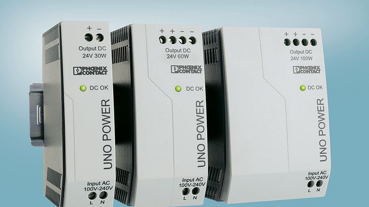 The new Uno Power supply units from Phoenix Contact are designed to reliably supply loads of up to 100 W with 24V DC or 12 V DC in compact control cabinets. Low standby losses and highly efficient operation guarantee a high level of energy efficiency. The product range comprises five modules.