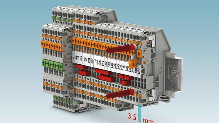 High signal density can be achieved for disconnect terminal blocks using the new knife disconnect terminal blocks with push-in connection technology with 3.5 mm pitch for conductors up to 1.5 mm² from Phoenix Contact. You can therefore save up to 30% space in the control cabinet. The PT 1,5/S-MT modular terminal block range includes two, three, and four-conductor terminal blocks as well as double-level versions. Feed-through terminal blocks of the same shape complete the range.