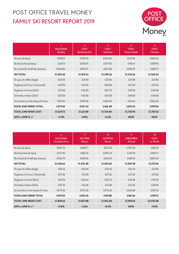 • Italy trumps Austria, France and Switzerland to take four of the top five places in the Family Ski Resort Report (www.postoffice.co.uk/familyskiing)