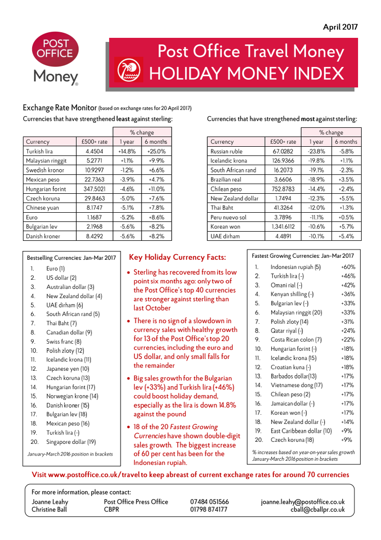• Latest currency index provides evidence of buoyant demand for holidays abroad as sterling recovers from 2016 low point