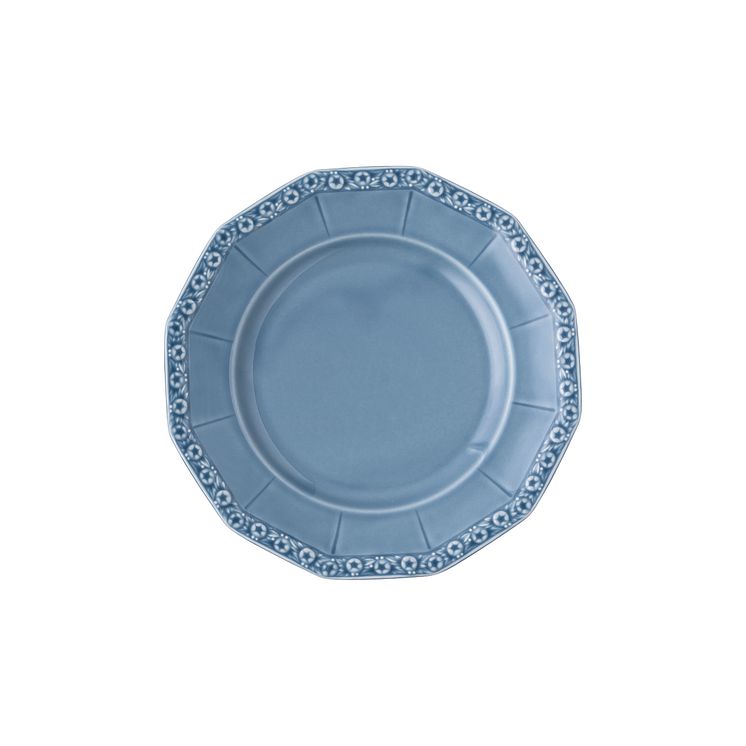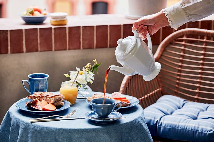 A delicate shade of blue underlines a romantic vintage touch to the new series and highlights the famous "Maria" relief of pomegranates and olive branches on breakfast plates, coffee and espresso cups, plates, cereal bowls and mugs even more.