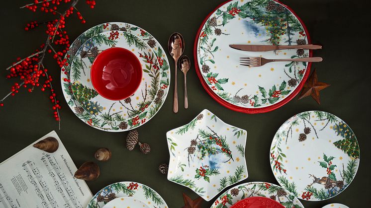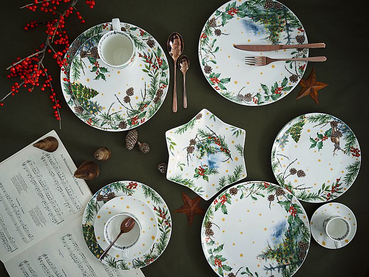 A colourful garland of red berries, cones, fir and mistletoe adorns plates, cups, napkins and biscuit tins, underlining a dreamy winter wonderland in the glow of the starry night. Delicate bells and balls, biscuit plates and a mini tree ornament set capture this poetic scenery in their evocative décors and bring a glimpse of nature into the home at Christmas time.