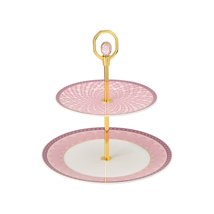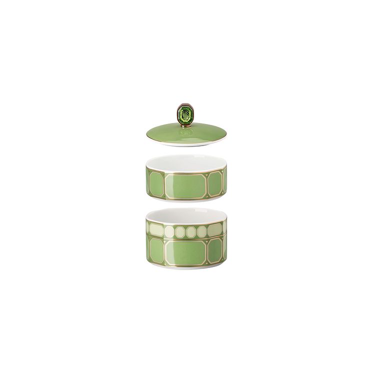 A decorative octagonal porcelain tray comes in uplifting green and gold tones. A special three-piece storage box, offered in green and pink, features a graphic octagonal print and crystal-topped lid. Comprising two internal levels, it is an exquisite display-ready choice designed to house precious and practical items and is complemented by a low storage box embellished with a stunning crystal topper. Further additions to the Swarovski x Rosenthal Signum collection include a small two-tier and a large three-tier etagere in green, each crowned with a gold-tone octagonal hoop and integrated crystal. The small etagere is also presented in a graceful pink version.