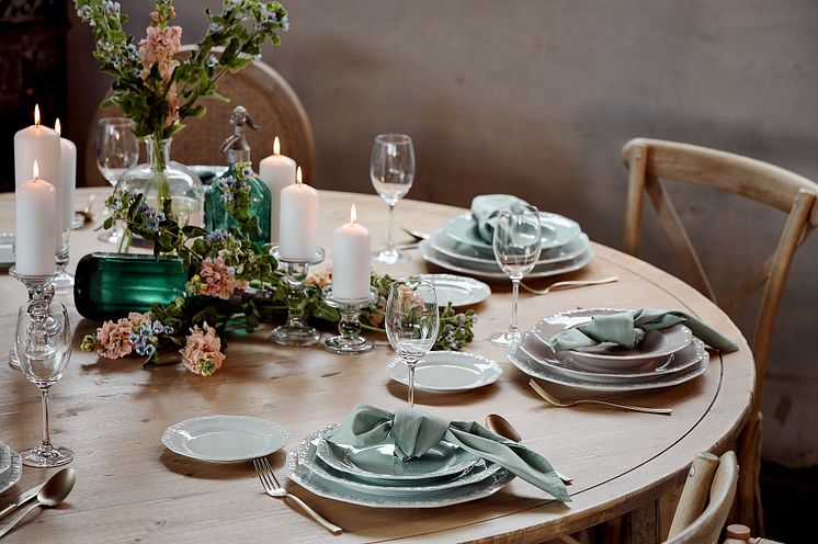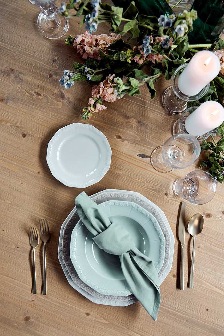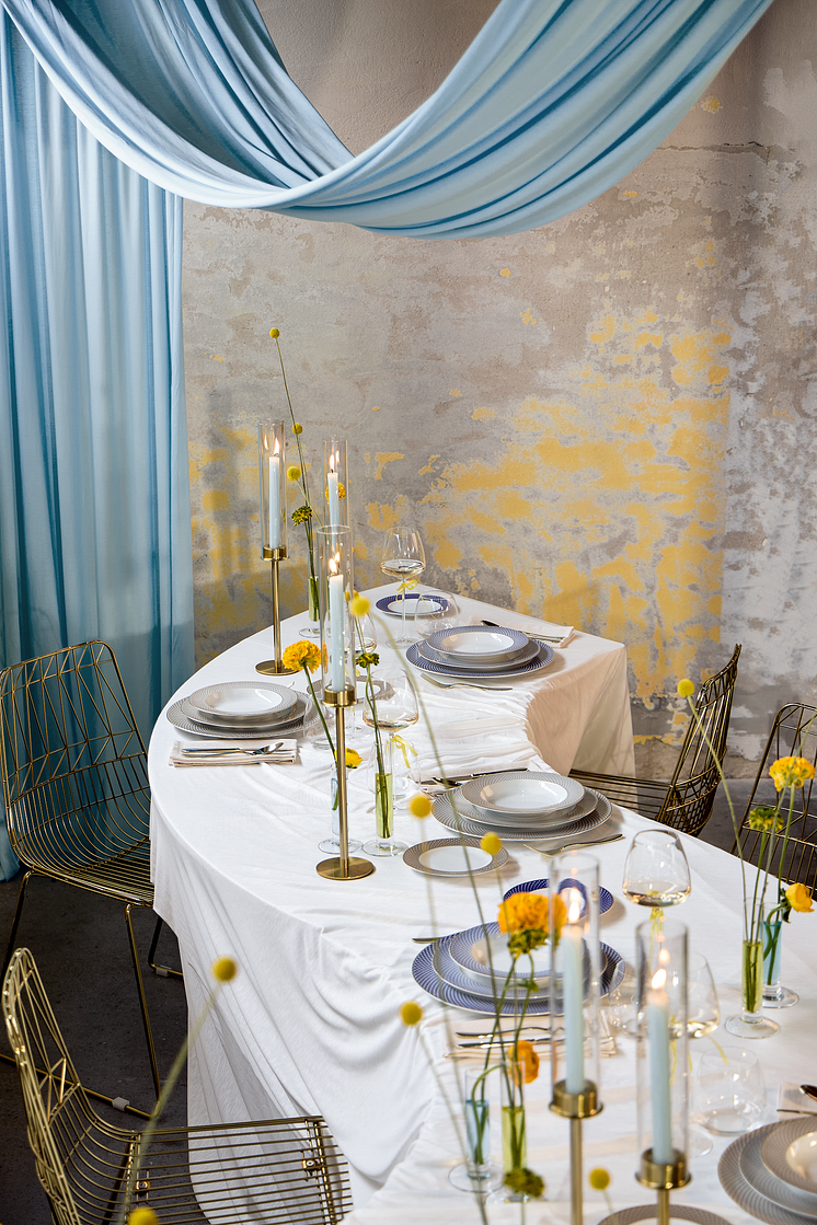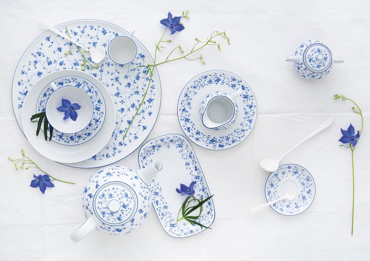 It doesn't always have to be the barn, but it can be...! Outdoor feeling, closeness to nature and a large portion of romance should not be missing at a country house style wedding. Whether it's a ballroom with a Nordic brick look, a country estate in Provence or an idyllic field with a night sky and fairy lights: Naturalness and rustic flair create a relaxed atmosphere at this wedding. Materials such as linen, wood and glass make a grounded ambience, while delicate floral decorations set up an elegantly festive atmosphere. Pastel colours such as apricot, cream or rosé are as much a part of the country house style as the bride and groom. The iconic 1382 Blaublüten service combines elegant country house chic with romantic flair. Blaublüten is the classic decoration on Hermann Gretsch's 1382 mould: delicate cornflower-blue blossoms entwine on white porcelain.