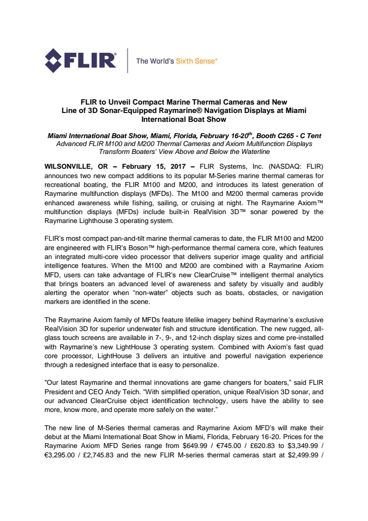 FLIR: FLIR to Unveil Compact Marine Thermal Cameras and New Line of 3D Sonar-Equipped Raymarine® Navigation Displays at Miami International Boat Show