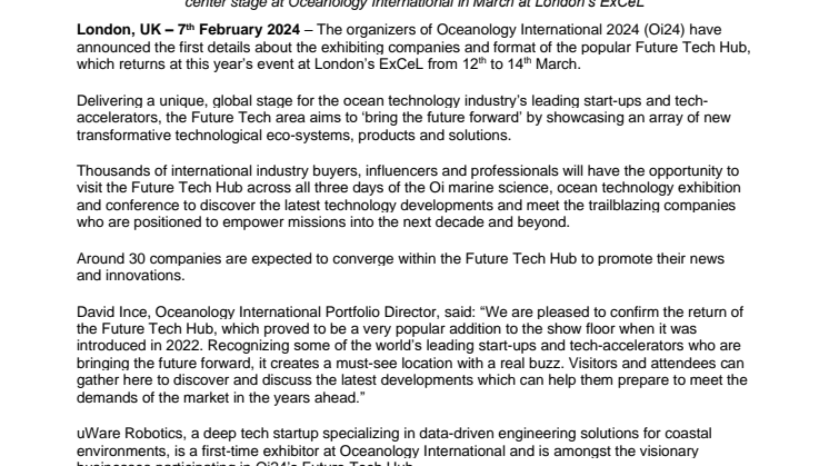 The organizers of Oceanology International 2024 (Oi24) have announced the first details about the exhibiting companies and format of the popular Future Tech Hub, which returns at this year’s event at London’s ExCeL from 12th to 14th March.