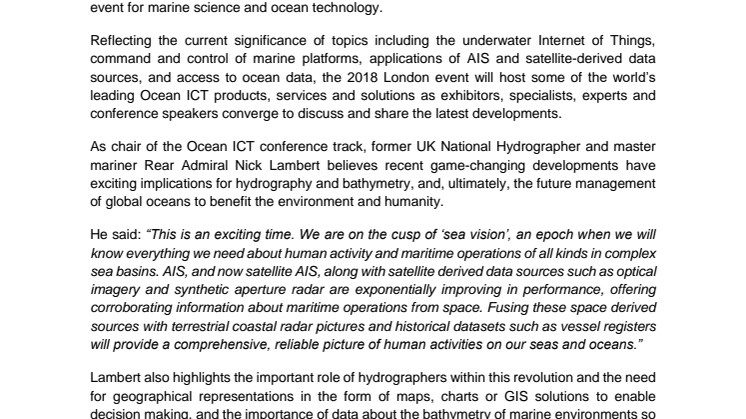 London, 26 January 2018 – The unfolding revolution in marine and ocean information and communications technology (ICT), and satellite and data solutions has been presented with its most prominent position yet at this year’s Oceanology International, the world's premier event for marine science and ocean technology.