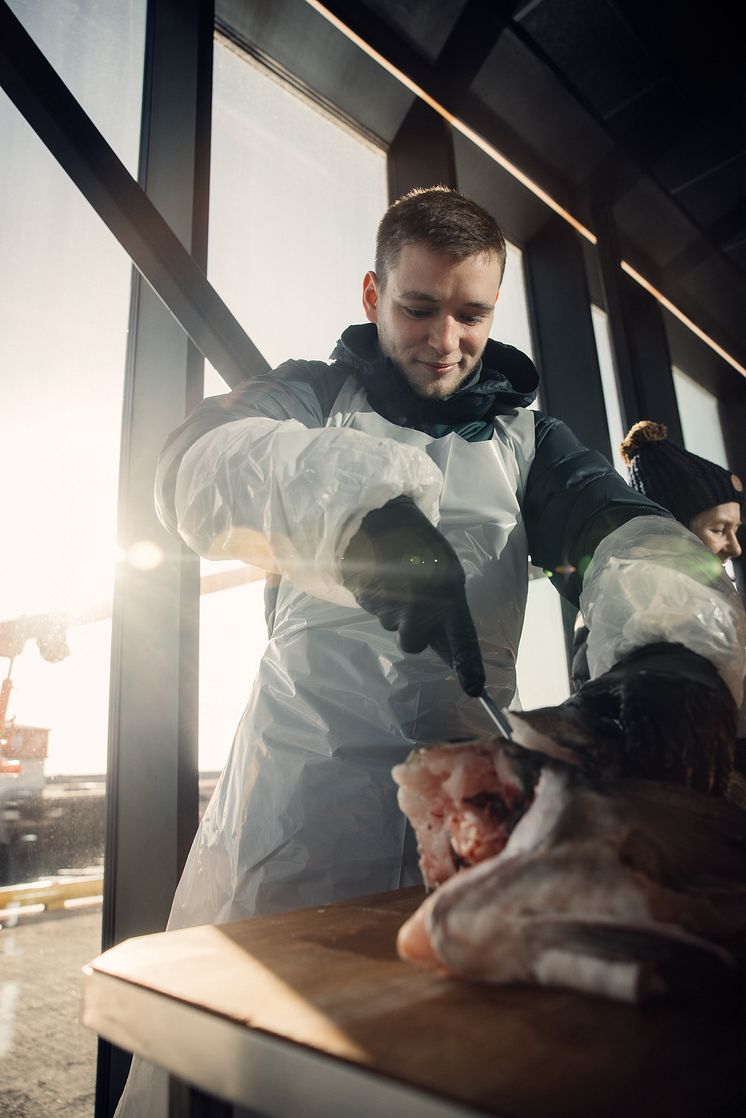 Sam Dixon YNCOTY winner tests his filleting skills on a skrei_photo credit- Norwegian Seafood Council_Kristoffer Lorentzen