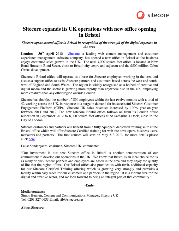 Sitecore opens second UK office in Bristol in recognition of the strength of the digital expertise in the area