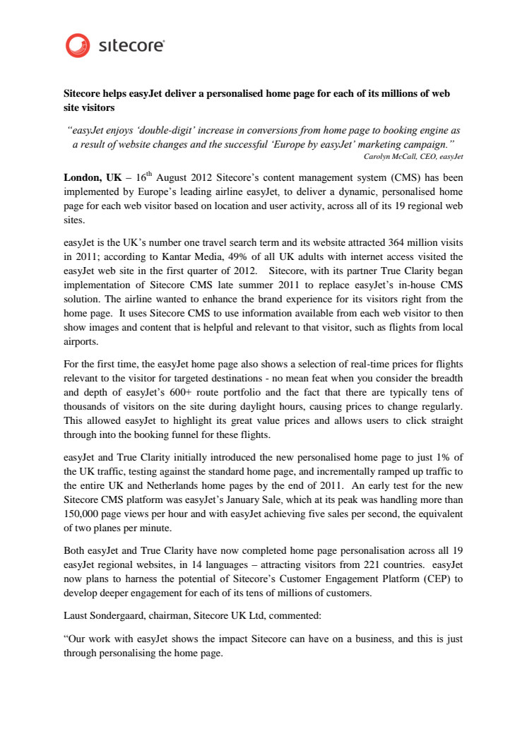 Sitecore helps easyJet deliver a personalised home page for each of its millions of web site visitors