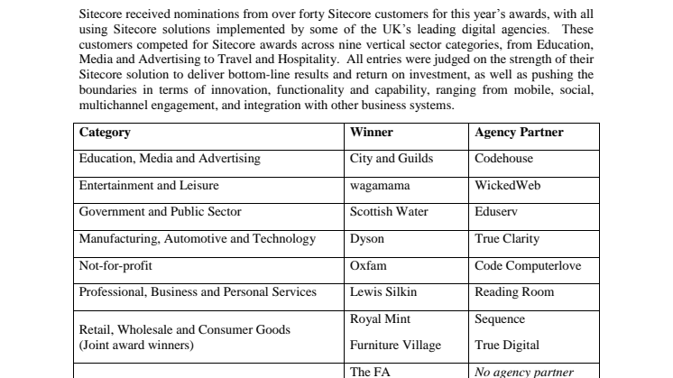 Sitecore received nominations from over forty Sitecore customers for this year’s awards, with all using Sitecore solutions implemented by some of the UK’s leading digital agencies. These customers competed for Sitecore awards across nine vertical sector categories, from Education, Media and Advertising to Travel and Hospitality. All entries were judged on the strength of their Sitecore solution to deliver bottom-line results and return on investment, as well as pushing the boundaries in terms of innovation, functionality and capability, ranging from mobile, social, multichannel engagement, and integration with other business systems.