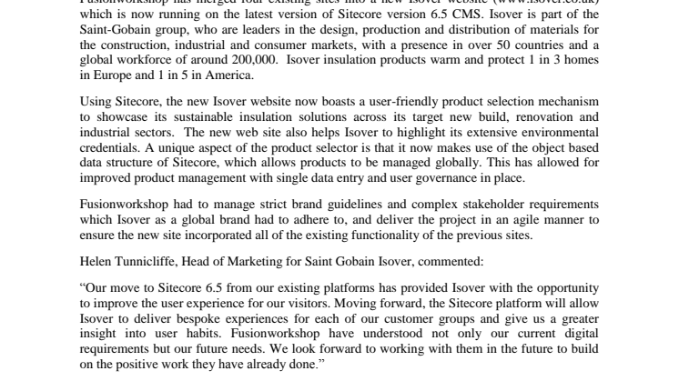 “Implementing Sitecore brings many business benefits for organisations such as simplifying content management processes which creates greater efficiencies, cost savings and ensures the most relevant, up-to-date content is always available for web site users. We are delighted that Isover has achieved its initial objectives and together with Fusionworkshop can realise its future ambitions for its digital channels.”