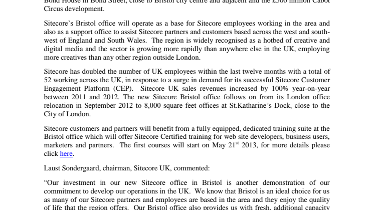 London – 30th April 2013 – Sitecore, a leading web content management and customer experience management software company, has opened a new office in Bristol as the business enjoys continued sales growth in the UK. The new 3,000 square feet office is located at New Bond House in Bond Street, close to Bristol city centre and adjacent and the £500 million Cabot Circus development.