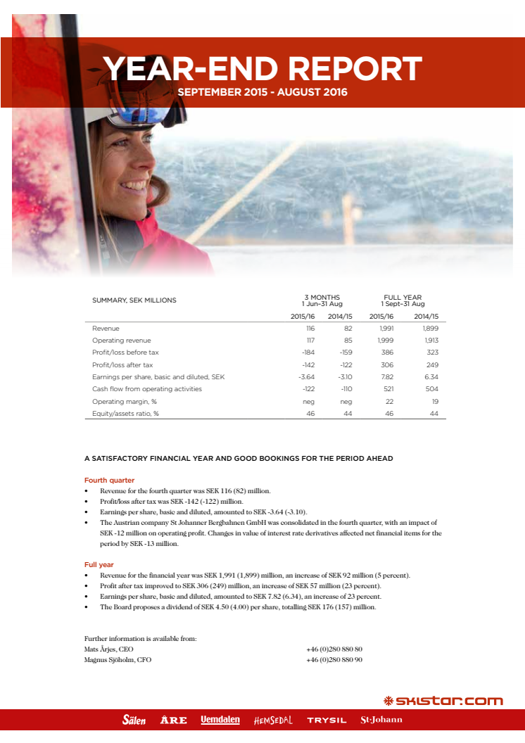 We have experienced another good winter season that has helped deliver a strong financial year with increased profit and exceeded financial targets. The number of skier days increased by 4 percent to 5.1 million, while the number of booked overnight stays increased by 5 percent to 524,000, says Mats Årjes, CEO at SkiStar.