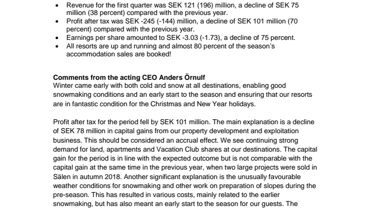 Profit after tax for the period fell by SEK 101 million. The main explanation is a decline of SEK 78 million in capital gains from our property development and exploitation business. This should be considered an accrual effect. We see continuing strong demand for land, apartments and Vacation Club shares at our destinations. The capital gain for the period is in line with the expected outcome but is not comparable with the capital gain at the same time in the previous year, when two large projects were sold in Sälen in autumn 2018. Another significant explanation is the unusually favourable weather conditions for snowmaking and other work on preparation of slopes during the pre-season. This has resulted in various costs, mainly related to the earlier snowmaking, but has also meant an early start to the season for our guests. The earnings effect is SEK -10 million in Q1, although there is no change over the entire season.