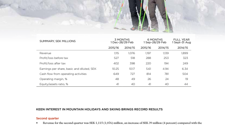 After a late start to the season due to mild weather, the business gained momentum from the Christmas and New Year holidays. In summarising the first six months, we are pleased to present the best results in SkiStar's history. More guests in January, partly due to Valle’ s Winter Weeks and SkiStar Business, combined with a good winter half-term break contributed to the improved results. Booking volumes increased by 9 percent from the start of the season to the end of February. A weak Norwegian krone has contributed to an increased inflow of foreign guests, mainly from the Danish market.