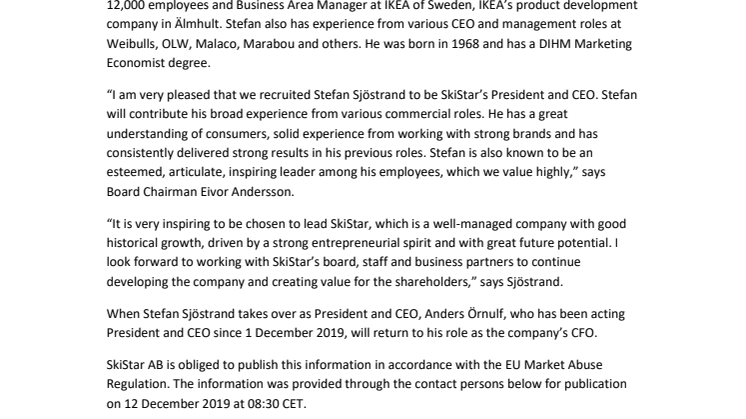 - I am very pleased that we recruited Stefan Sjöstrand to be SkiStar’s President and CEO. Stefan will contribute his broad experience from various commercial roles. He has a great understanding of consumers, solid experience from working with strong brands and has consistently delivered strong results in his previous roles. Stefan is also known to be an esteemed, articulate, inspiring leader among his employees, which we value highly,” says Board Chairman Eivor Andersson.