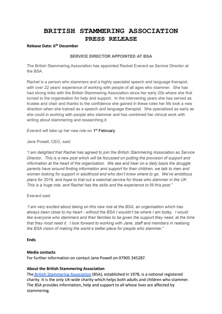 The British Stammering Association has appointed Rachel Everard as Service Director at the BSA.