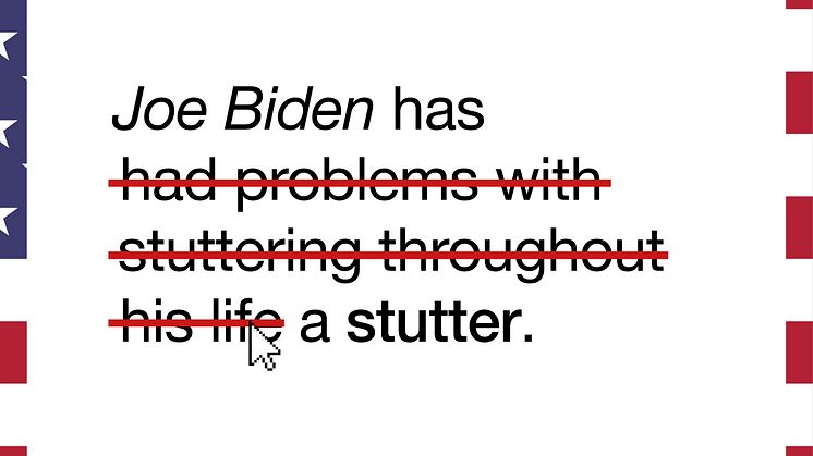 CEO of Stamma, Jane Powell said “Last month in our #FindTheRightWords campaign we replaced all the negative wording in Wikipedia around stammering - an act endorsed by the CEO of Wikimedia who said that the 'wording around stammering was not neutral before, and reinforced negative perceptions about stammering’. The negative wording used in relation to Joe Biden’s stammer persists. We urge the media to read and use our Guidelines on the subject".