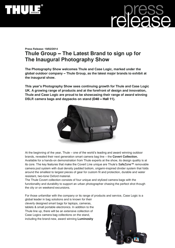 The Photography Show welcomes Thule and Case Logic, marked under the global outdoor company – Thule Group, as the latest major brands to exhibit at the inaugural show.