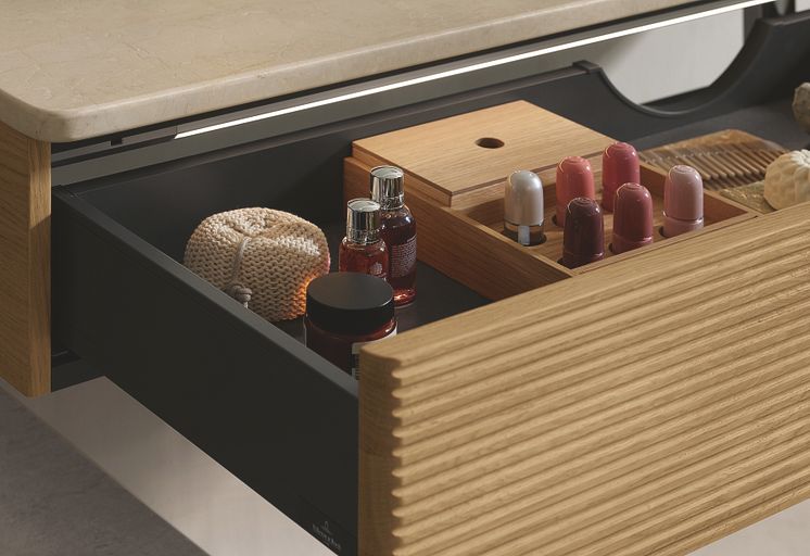 The organic shapes of the Antao bathroom collection, which is inspired by nature, don’t just create a visually peaceful and relaxing effect, but ensure, thanks to its interior, that all stress vanishes. The push-to-open mechanism means that a simple tap is sufficient to open the vanity units and reveal their contents. The LED drawer lighting, which is available on request, creates the perfect look. High-quality solid oak inserts provide the perfect place to store every little thing. In addition to cross inserts, boxes and lids, you can even have your own nail varnish and lipstick holders. Consoles and additional units, including highboards, tall cabinets, sideboards and mid-size cabinets provide storage solutions for every need. From bath products to hand towels: Everything is hidden behind the stylish fronts in natural-looking finishes or solid wood.