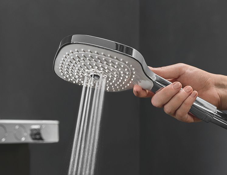The 130 mm hand shower combines an exciting angular design with a choice of three functions: from a velvety soft Relax flow mode to a pulsating eight-jet massage, with a crystal-clear laminar flow in the middle. The height, position and angle of the hand shower can be adjusted without any additional control button. The XXL shower head also features an angular design and offers a choice of two individual settings: Relax flow mode and Waterfall. The EasyClean feature makes light work of cleaning the silicone jets on the hand shower and shower head and allows limescale to be removed easily with a finger. EasySwitch also ensures effortless transition between the different flow modes at the touch of a button.