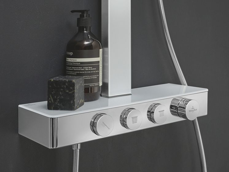 Different glass elements create a high-quality look. The shower thermostats have one function while the bath versions are available with two. Another practical element is the glass shelf integrated perfectly in the design.