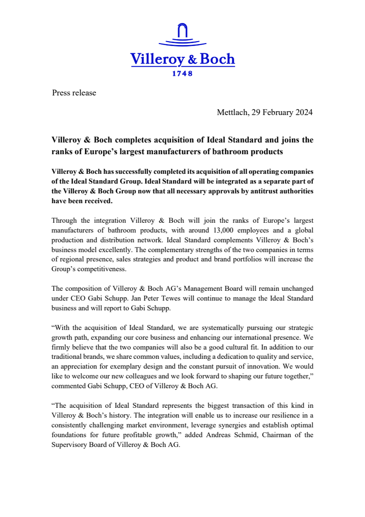 Villeroy & Boch has successfully completed its acquisition of all operating companies of the Ideal Standard Group. Ideal Standard will be integrated as a separate part of the Villeroy & Boch Group now that all necessary approvals by antitrust authorities have been received.
