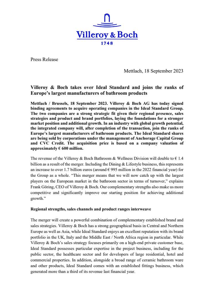 Mettlach / Brussels, 18 September 2023. Villeroy & Boch AG has today signed binding agreements to acquire operating companies in the Ideal Standard Group. The two companies are a strong strategic fit given their regional presence, sales strategies and product and brand portfolios, laying the foundations for a stronger market position and additional growth. In an industry with global growth potential, the integrated company will, after completion of the transaction, join the ranks of Europe’s largest manufacturers of bathroom products. The Ideal Standard shares are being sold by corporations under the management of Anchorage Capital Group and CVC Credit. The acquisition price is based on a company valuation of approximately € 600 million.