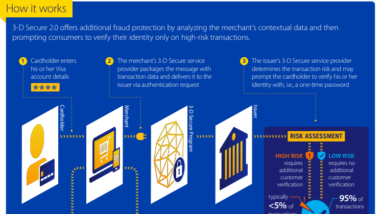 The updated technology behind 3-D Secure 2.0 provides more tools for issuers and merchants to customize the authentication process and ensure the consumer experience is easy and fast. By building a real-time, collaborative, information-sharing pipeline, Visa has enhanced the data transfer between merchants and issuers to use an unprecedented number of transaction attributes (e.g. device type, shipping address). This allows merchants and financial institutions to authenticate customers more accurately in real-time. Studies show checkout time can be reduced by 85 percent and, in turn, cart abandonment is anticipated to decline by as much as 70 percent. Click here for more information.