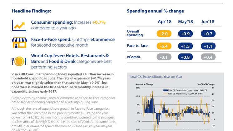 “The latest set of Visa UK CSI data show that household spending trends improved further in June, likely helped by the much warmer weather and the World Cup. Notably, June marks the first back-to-back monthly increase in spend for over a year, as consumers splashed out on meals out and at supermarkets.