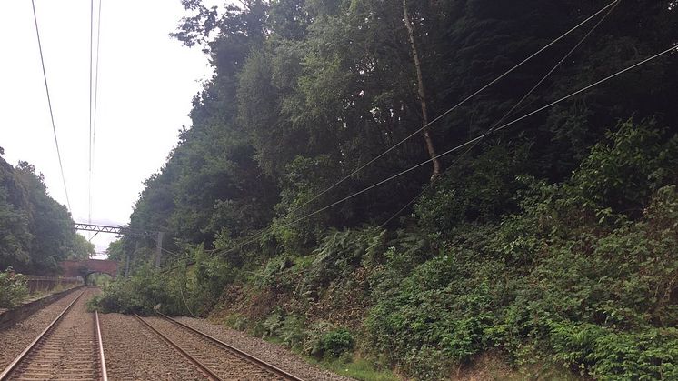 The first tree fell onto the northbound line towards Birmingham at around 1100 yesterday (14 Aug) and caught fire. The line was then closed in both directions for the remainder of the day.