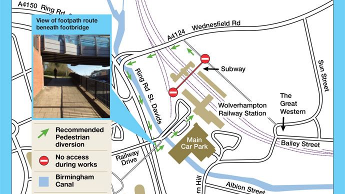 A recommended, temporary diversion route will be put in place for customers wanting to access the station via Wednesfield Road (see Station Acces map [690kb]).