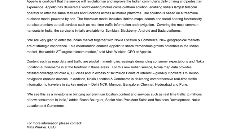 “We are very glad to enter the Indian market together with Nokia Location & Commerce. New geographical markets are of strategic importance. This collaboration enables Appello to share tremendous growth potentials in the Indian market, the world’s 2nd largest telecom market,” said Mats Winkler, CEO at Appello.