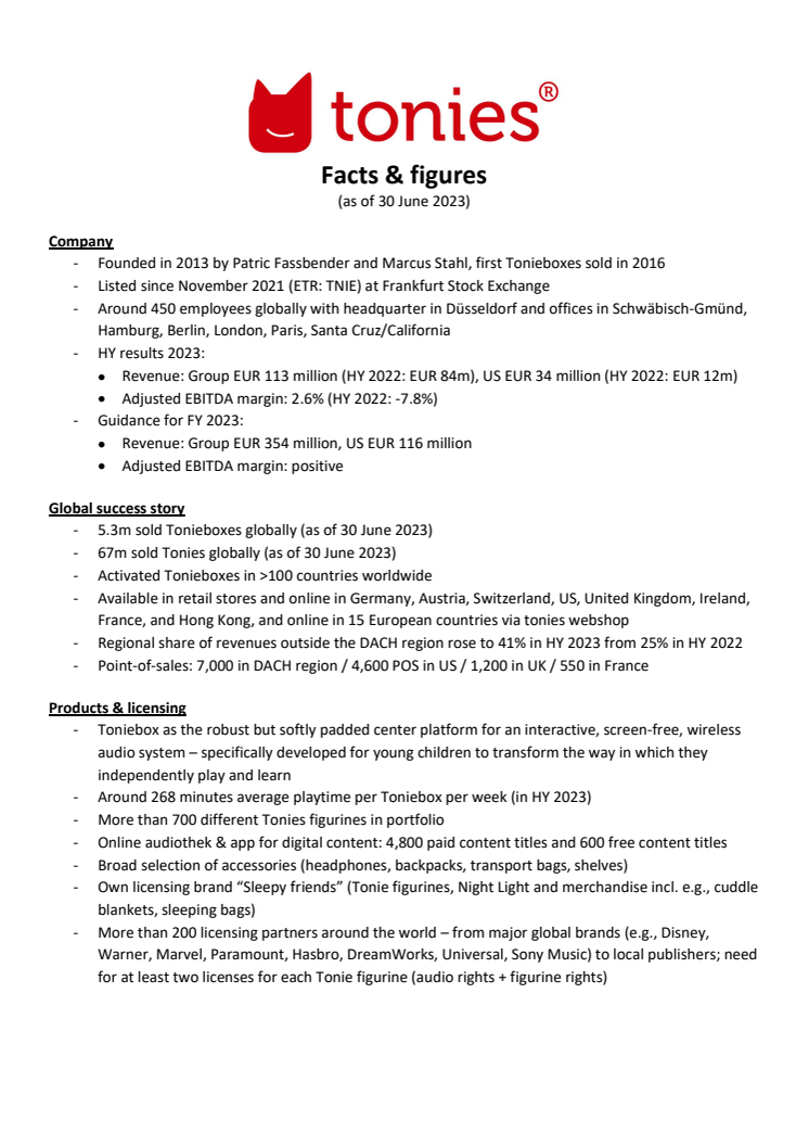 tonies has more than 560 employees, achieved a group revenue of €481 million in the last fiscal year 2024 (+33% YoY) and is listed on the Frankfurt Stock Exchange (tonies SE).