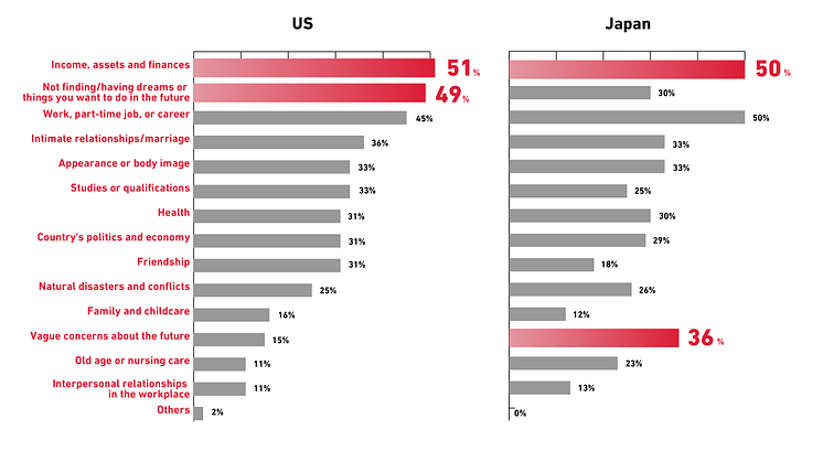 Anxiety about overall respondents’ personal future in both the U.S. and Japan stems largely from financial concerns. However, when comparing the two countries, respondents in Japan mentioned "vague concerns about the future," while in the U.S., a common concern was the lack of or inability to identify future aspirations or dreams. This suggests that in the U.S., a lack of future dreams and ambitions significantly influences individuals’ hopes for their future.