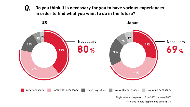 When questioned about the importance of experiences in discovering their ambitions, 69% of those aged 18–24 in Japan and 80% in the U.S. responded that this was "very necessary" or "somewhat necessary."