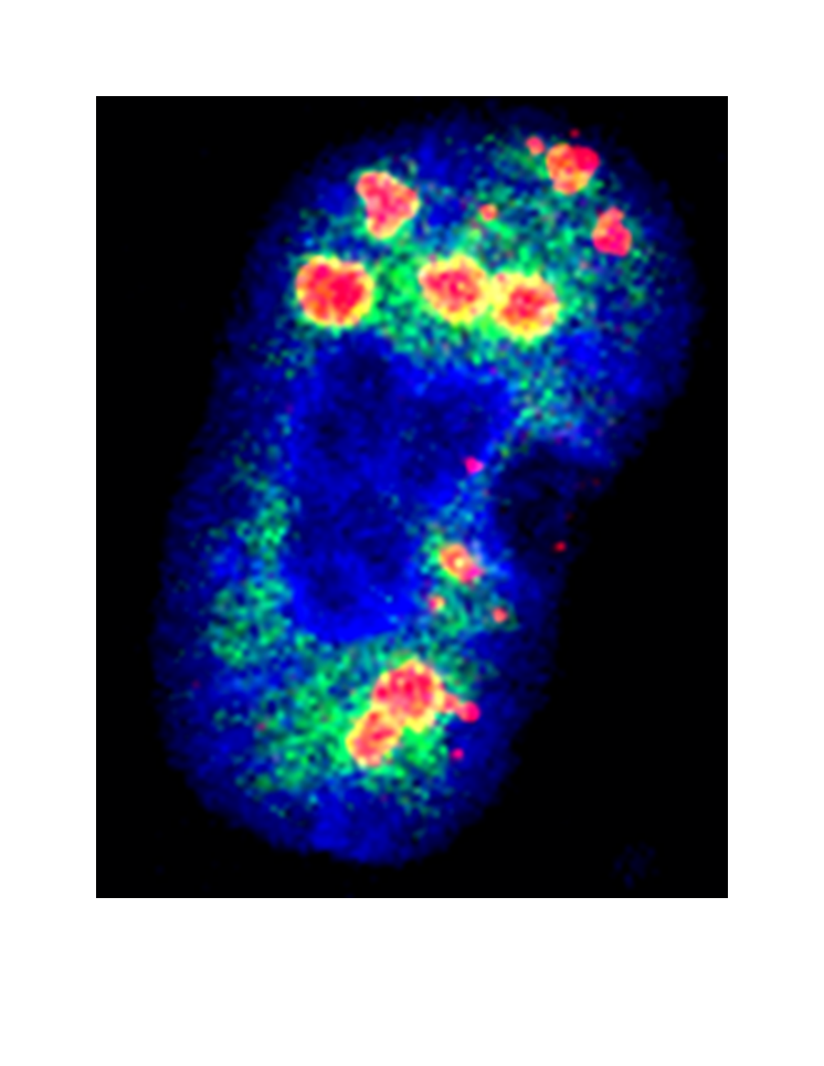 Image 2. The ZC3H11A protein (in green) surrounds the adenovirus replication centers in human in HeLa cells. Photo: Shady Younis.
