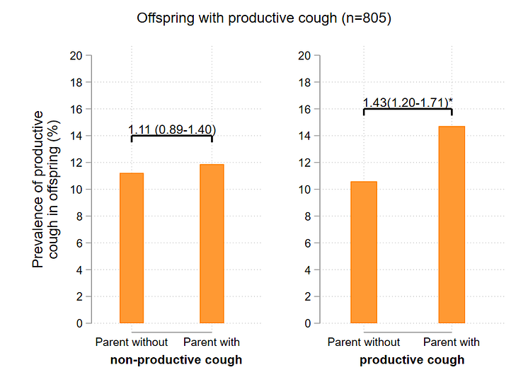 Example 2. Prevalence of dry cough and productive cough in adult offspring, by prevalence of cough in parent.