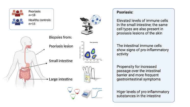 The study involved 18 patients with psoriasis and 15 healthy controls as subjects. None of the participants had been diagnosed with gastrointestinal diseases. Samples were taken from both their small and large bowel. The researchers then studied different types of immune cells in the mucous membrane.
