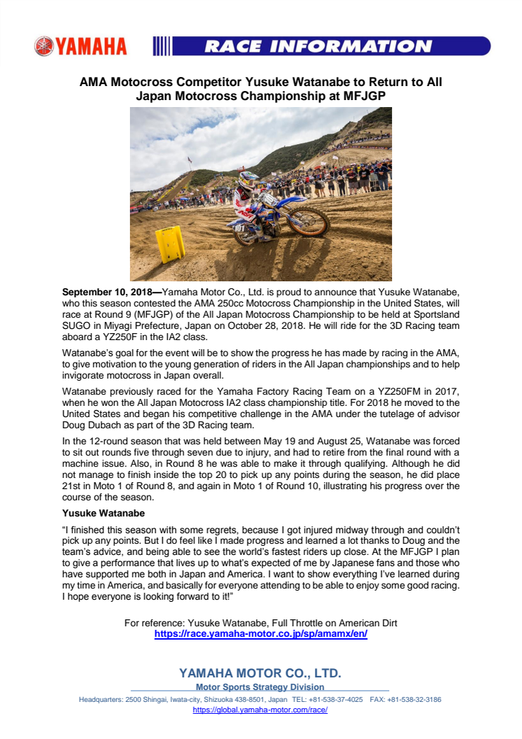 AMA Motocross Competitor Yusuke Watanabe to Return to All Japan Motocross Championship at MFJGP