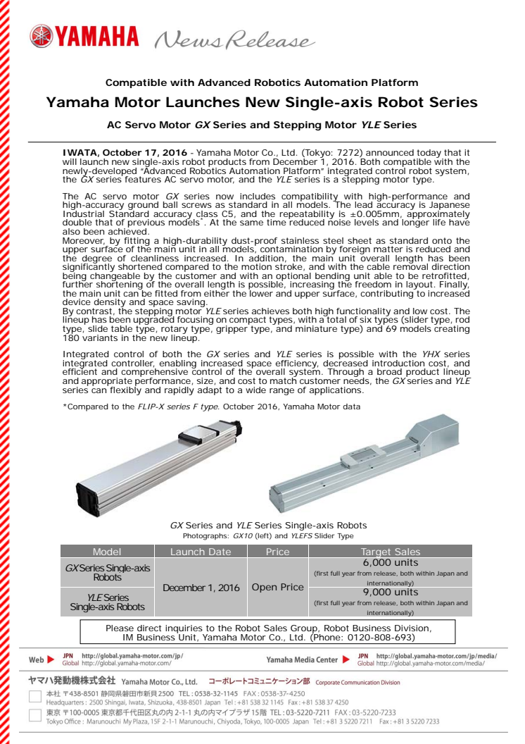 Compatible with Advanced Robotics Automation Platform Yamaha Motor Launches New Single-axis Robot Series AC Servo Motor GX Series and Stepping Motor YLE Series