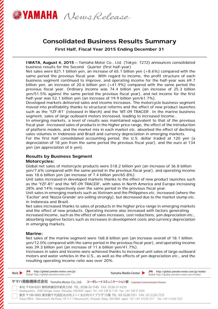Consolidated Business Results Summary ~First Half, Fiscal Year 2015 Ending December 31~